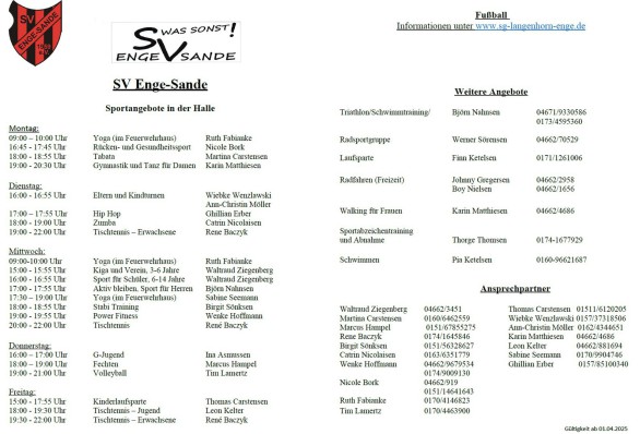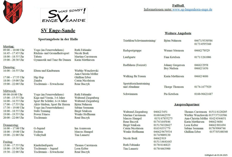 Der Sportverein Enge-Sande bietet Ihnen eine umfangreiche Auswahl an Leistungen. Aktiv bleiben und dabei sein! Bei uns sind Sie genau richtig, wenn es um Spaß und gemeinsame Aktivitäten geht.