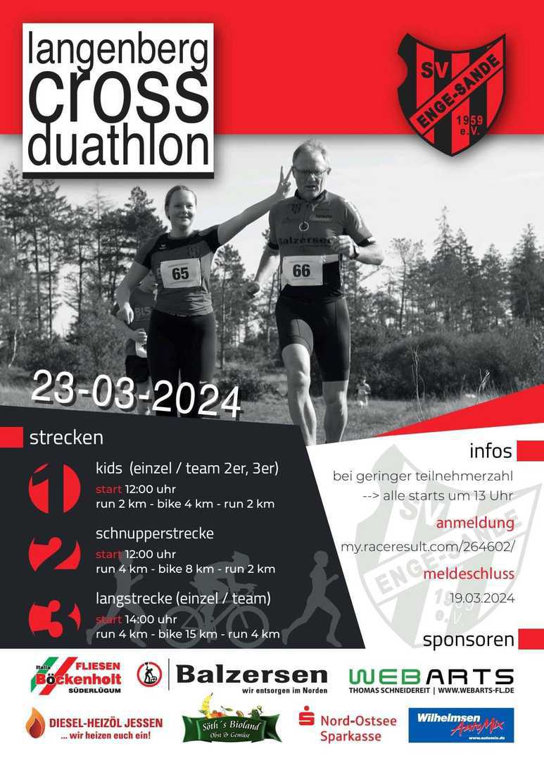 Der SV Enge-Sande lädt ein zum Fischteiche Cross 2024 im Langenberger Forst. Alle Infos sind dem Flyer zu entnehmen, wir freuen uns über jede Anmeldung, ob jung oder alt!